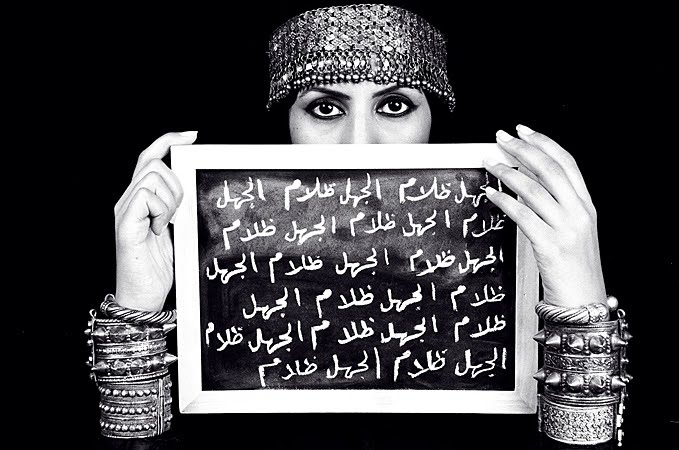 The photograph above is by Manal Al Dowayan; a photographer who lived for most of her life in a semi-enclosed compound in Daharan in the Eastern Province of Saudi Arabia. Much of her work is about female identity in the conservative Muslim Middle East. The photograph above is titled "I am an educator", while the writing on the slate reads "ignorance is darkness" repeated many times. Her work is featured on the Greater Middle East Photo blog.